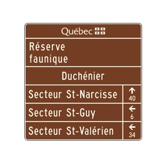 Le panneau « Réserve faunique exploitée par le ministère de l’Environnement, de la Lutte contre les changements climatiques, de la Faune et des Parcs » (I-460-16) indique la présence d’une réserve faunique