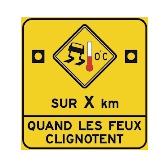 Le panneau « Chaussée glacée » (D-62-5) indique que la chaussée d’un chemin public, d’un pont ou d’un pont d’étagement peut être glacée ou givrée lorsque la température est près du point de congélation.