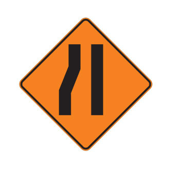 Le panneau « Chaussée rétrécie » (T-D-210-2-G) indique qu’il y a réduction de la largeur de la chaussée mais qu’il n’y a pas de réduction du nombre de voies de circulation. Le panneau T-D-210-2-G indique un rétrécissement par la ga