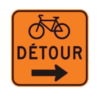 Le panneau « Détour pour cyclistes » (T-90-6-D) indique la direction du chemin de détour que doivent suivre les cyclistes en raison des travaux.
