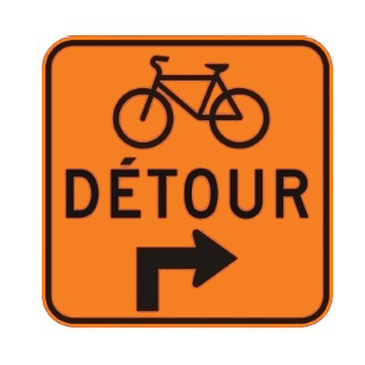 Le panneau « Détour pour cyclistes » (T-90-8-D) indique la direction du chemin de détour que doivent suivre les cyclistes en raison des travaux.
