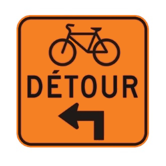 Le panneau « Détour pour cyclistes » (T-90-8-G) indique la direction du chemin de détour que doivent suivre les cyclistes en raison des travaux.