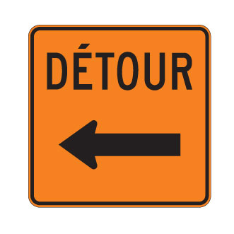 Le panneau « Détour » (T-90-2-G) indique la direction de l’itinéraire de détour prévu que doivent suivre les usagers de la route en raison des travaux.