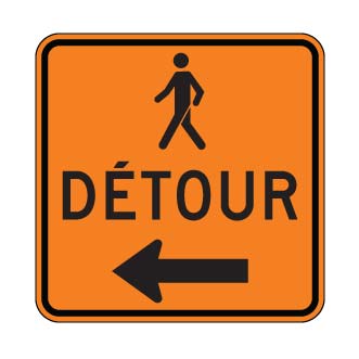 Le panneau « Détour pour piétons » (T-90-16-G) indique la direction du détour à suivre par les piétons en raison de travaux.