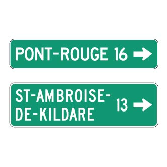 Les panneaux «Direction» (I-100-1) indiquent les destinations les plus importantes pouvant être atteintes en empruntant chacune des branches formant l’intersection.