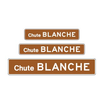 Le panneau d’élément hydrographique « Chute » (I-210-5) indique le nom d’une chure figurant sur la Carte routière du Québec.
