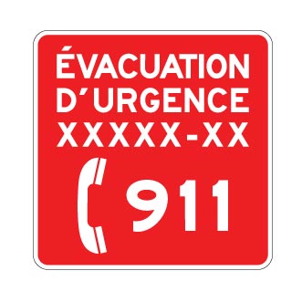 Les panneaux « Évacuation d’urgence » (I-377-2) indiquent qu’un site d’évacuation d’urgence est accessible à partir d’un sentier afin de permettre à ses usagers de rejoindre un chemin public accessible en tout temps par les services d’urgence.