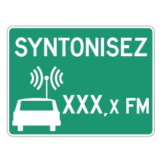 Le panneau « Fréquence radio » (I-416) indique aux usagers qu’ils peuvent syntoniser une fréquence radio réservée à la diffusion des messages appropriés dans un secteur donné.