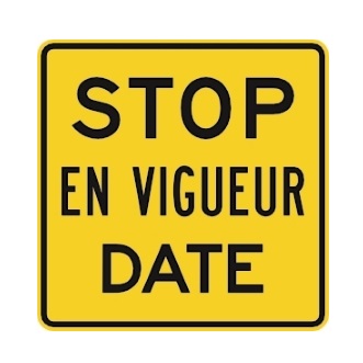 Le panneau « Nouvelle signalisation – Stop en vigueur » (D-40-2) indique un changement dans la régulation de la circulation à un carrefour. Il doit être installé pendant le mois précédant l’installation du nouveau panneau « Stop ».