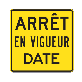 Le panneau « Nouvelle signalisation – Arrêt en vigueur » (D-40-2) indique un changement dans la régulation de la circulation à un carrefour. Il doit être installé pendant le mois précédant l’installation du nouveau panneau « Arrêt ».
