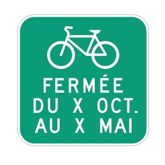 Le panneau «Période de fermeture» (I-372) indique la période de l’année durant laquelle la piste cyclable n’est pas accessible aux cyclistes.