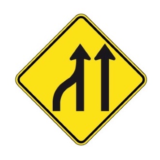 Le panneau « Perte de voies » (D-220-2-G) indique que le nombre de voies dans le même sens de circulation est réduit. Il doit être utilisé sur un chemin public ayant 3 voies et plus. Il doit être utilisé lorsque la réduction de voies se fait par la droite