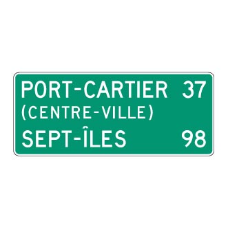 L’inscription « CENTRE-VILLE » peut être ajoutée au nom de la destination, s’il y a lieu. Elle est toujours écrite en majuscules, entre parenthèses, sous le nom de l’agglomération.