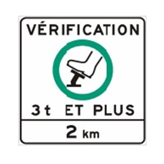 Le panneau « Aire de véification des freins » (P-231-1) indique au conducteur d’un véhicule routier dont la masse totale en charge est d’au moins 3000 kg de vérifier l’état des freins de son véhicule en effectuant un arrêt à l’endroit indiqué.