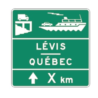 Le panneau d’acheminement « Traverse maritime » (I-320-3) indique la présence d’une traverse maritime pour les véhicules. Le I-320-3 réalise l’acheminement sur le réseau routier du Ministère.